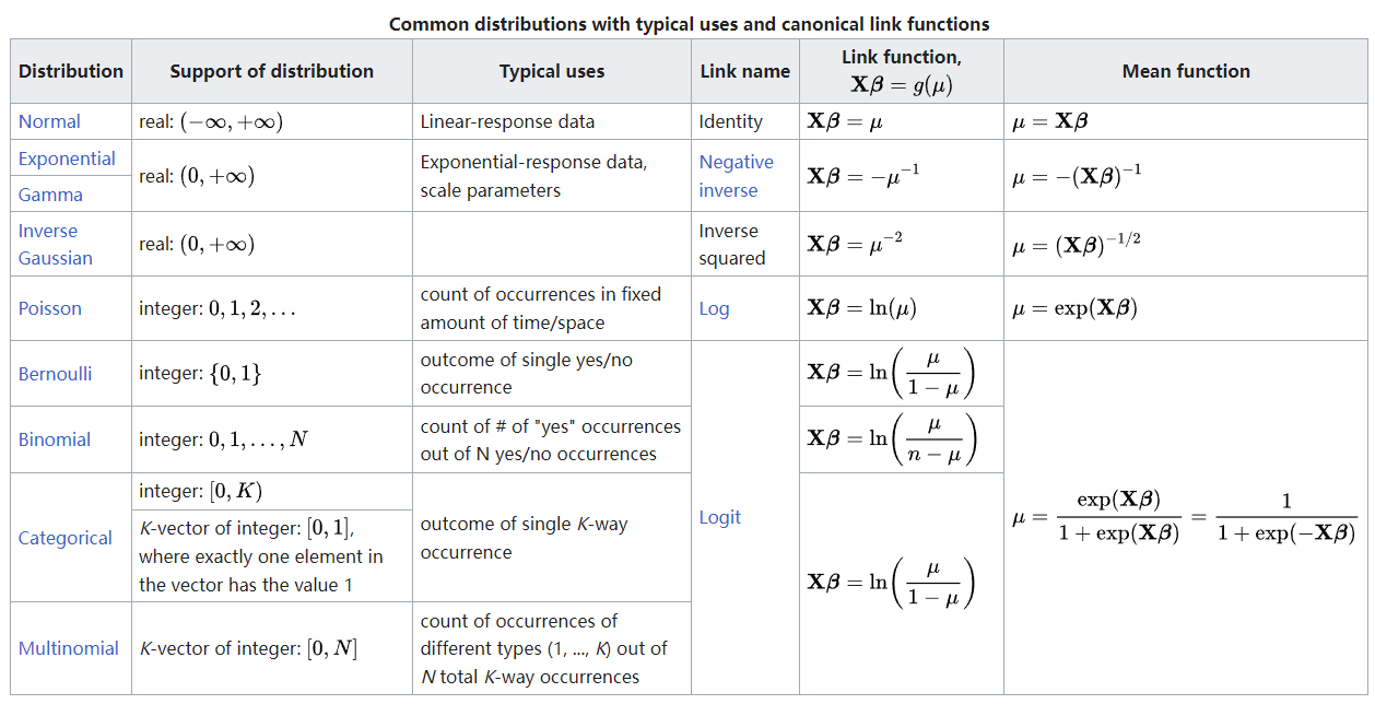 广义线性模型由 Nelder 和 Wed derburn 在 1972 年提出,详见 Generalized Linear Models。简单来说,广义线性模型就是使用连接函数(Link Function),使得可以是非连续、非正态的因变量可以表示为自变量的线性组合。对于线性回归模型,假设变量连续、正态。对于因变量离散、非正态的情况,线性回归模型的假设就得不到满足。而广义线性模型仅要求因变量的分布属于指数分布族(Exponential Family),对因变量没有任何的限制。